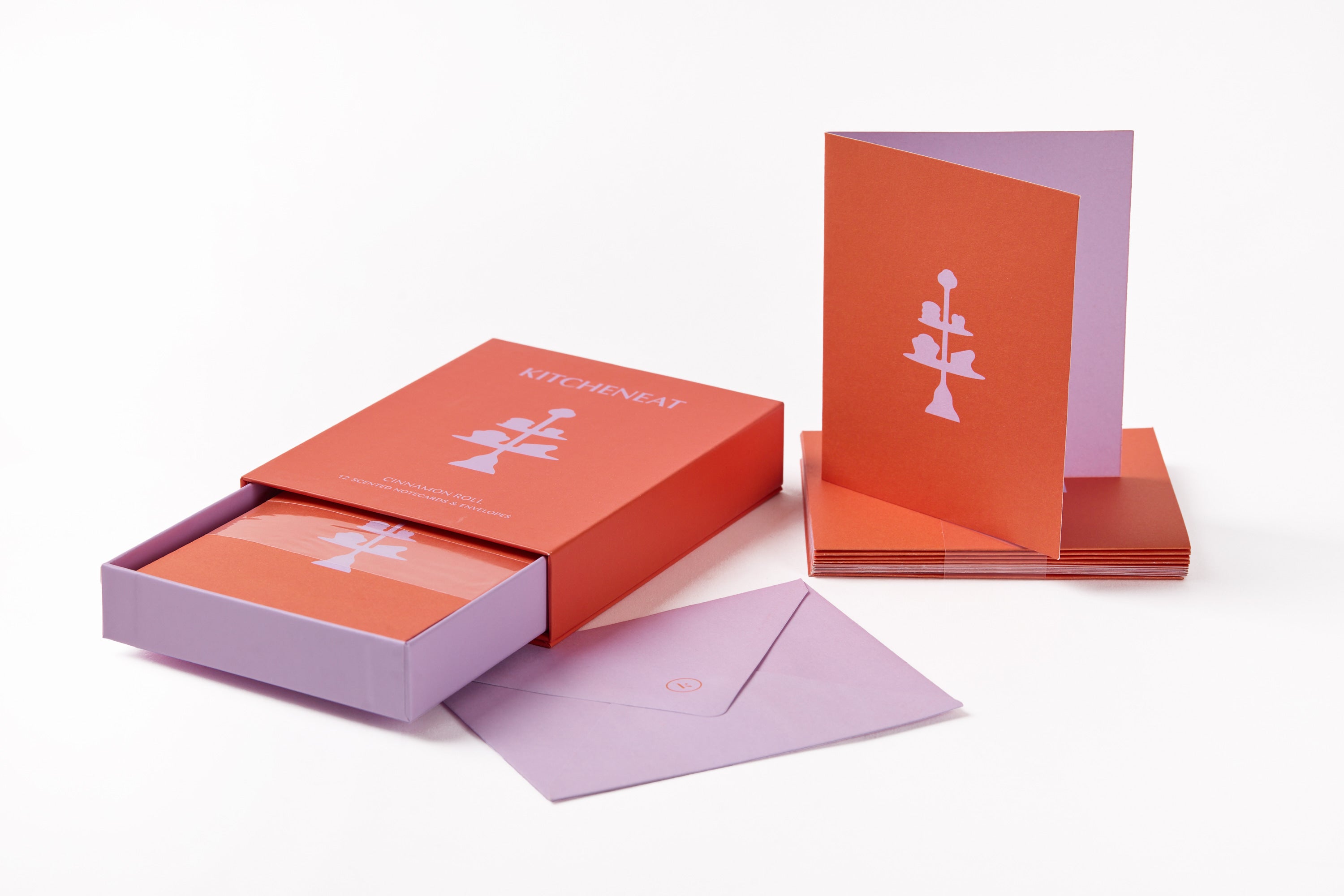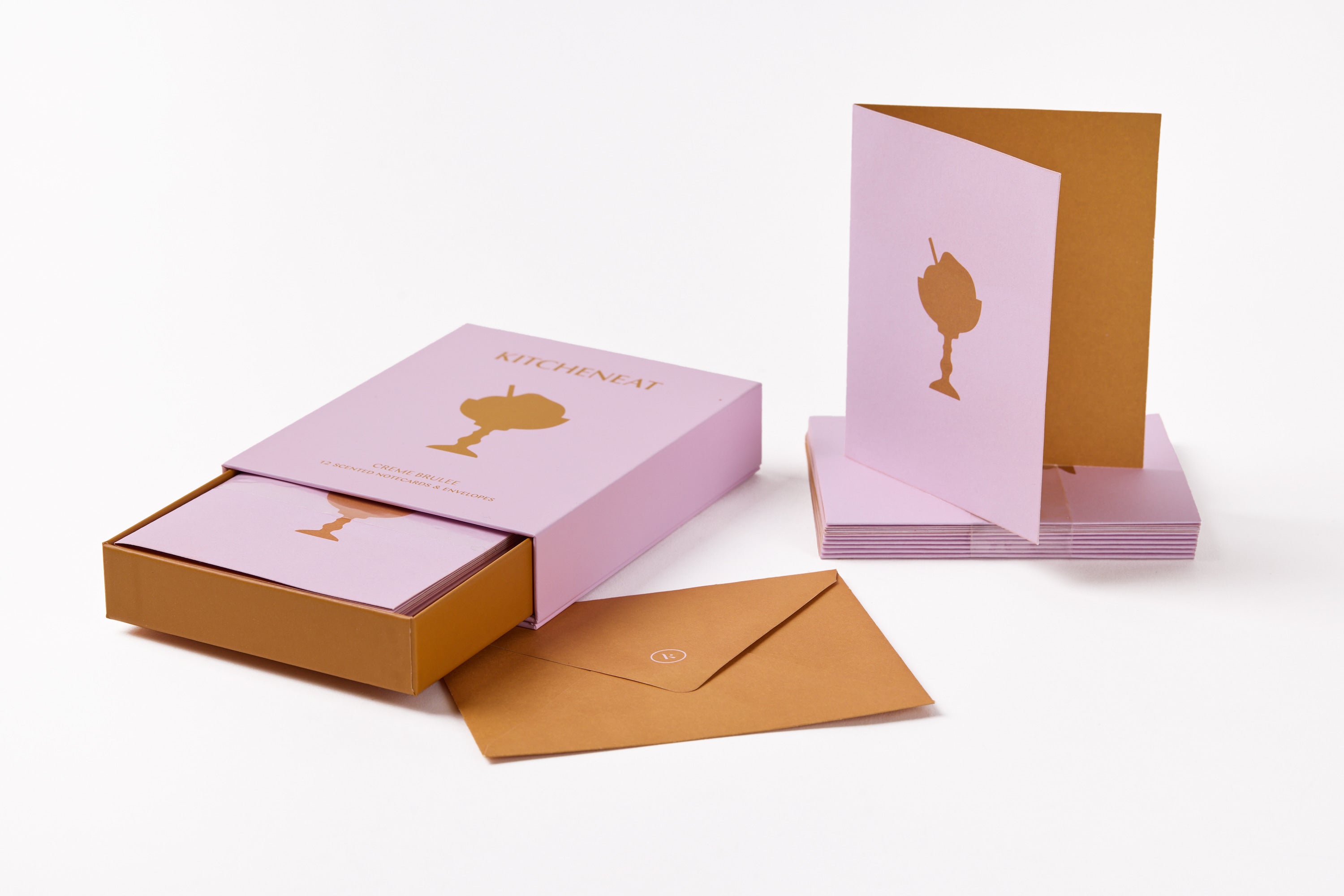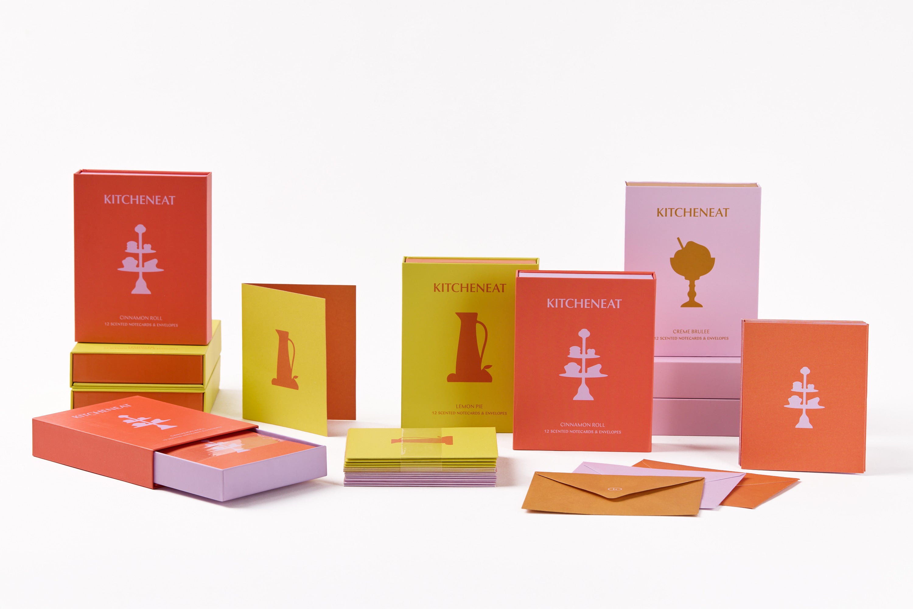 A scented set that includes a stylish drawer box that holds 12 notecards and envelopes, each infused with the delicate fragrance of cinnamon roll, creme brulee, or lemon pie.